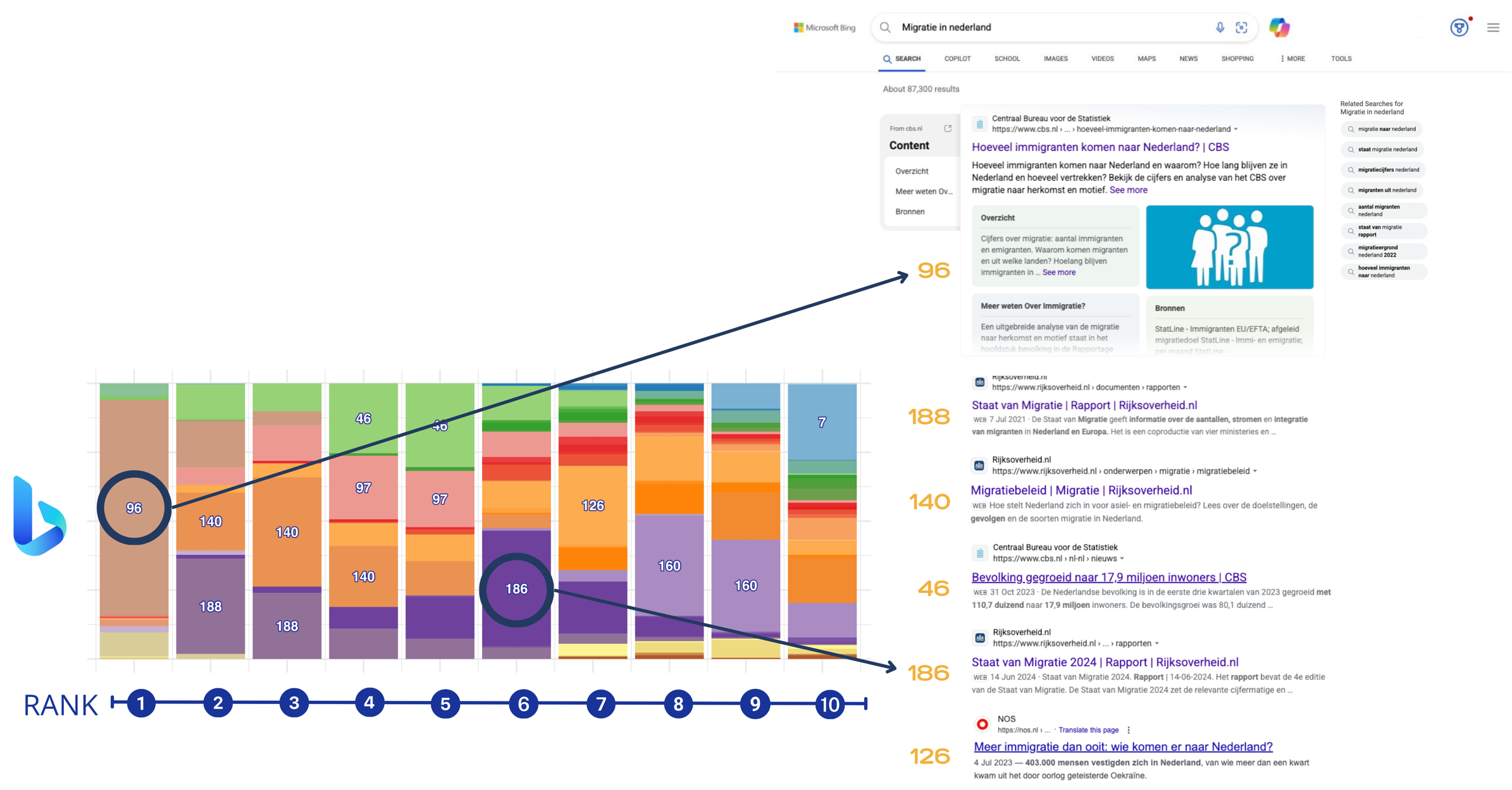 Benieuwd naar wat er achter de schermen gebeurt wanneer je iets complex als "Immigratie" op Google zoekt? Laten we het verduidelijken met een kleurrijke grafiek die weergeeft hoe vaak elke link verschijnt. Stel je voor dat elke kleur in de grafiek een verschillende link vertegenwoordigt, elk geïdentificeerd door een uniek nummer.